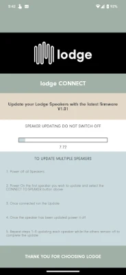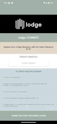 The lodge sound app is currently designed to enable OTA (over the air) firmware updates only. These updates will ensure that your speaker performance is optimal.