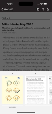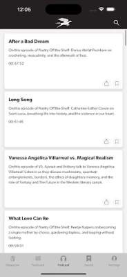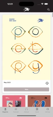 The premier outlet for contemporary voices and poetic legacies, Poetry has been connecting readers with great poetry since 1912.The POETRY Magazine app delivers all the poems, prose, and special portfolios found in the monthly print edition of POETRY, plus exclusive digital extras, such as audio of authors reading their poems, translators’ notes, podcasts, archival content, and more. It also allows you to save your favorite poems and prose in each issue.